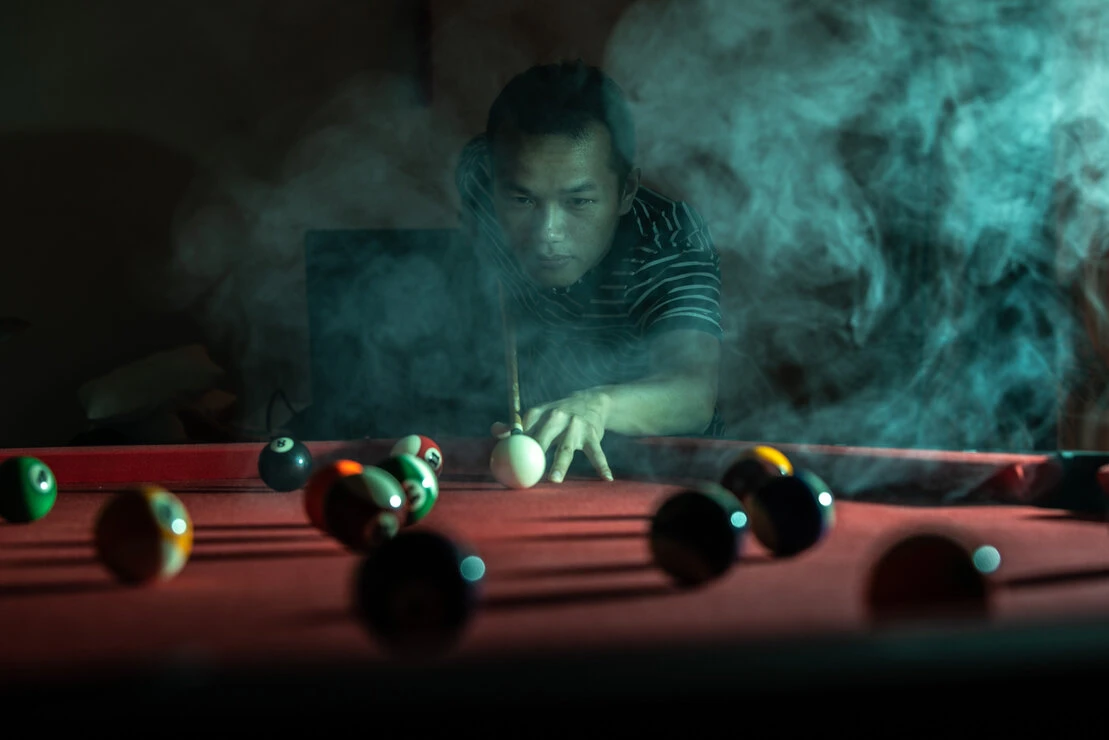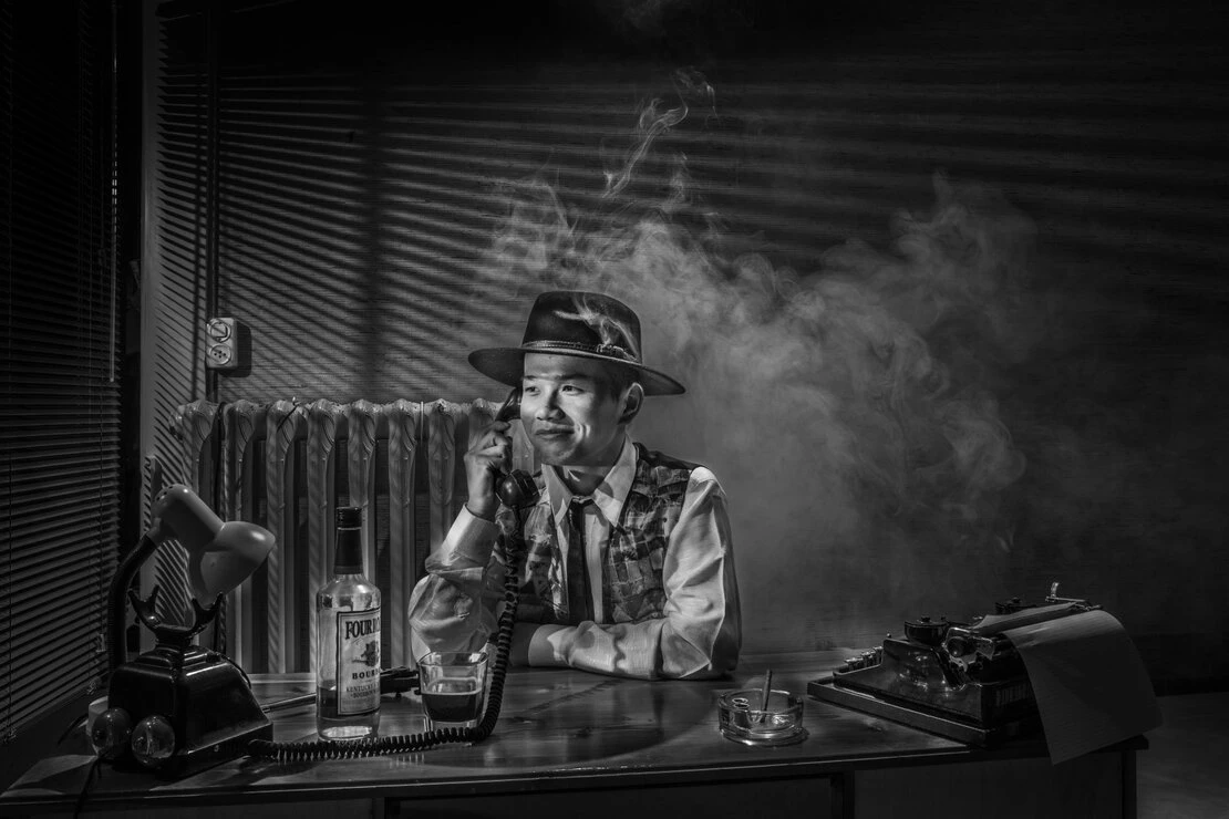 Essai en pleine journée avec un flash puissant pour tuer la lumière du jour et ajout de fumée pour donner un air d'ancien tripot