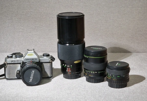 これは私の最初のフィルムカメラで、1980年代に購入したヤシカFx-7と35mm、50mm、135mmマクロ、後に300mmレンズのキットだ。